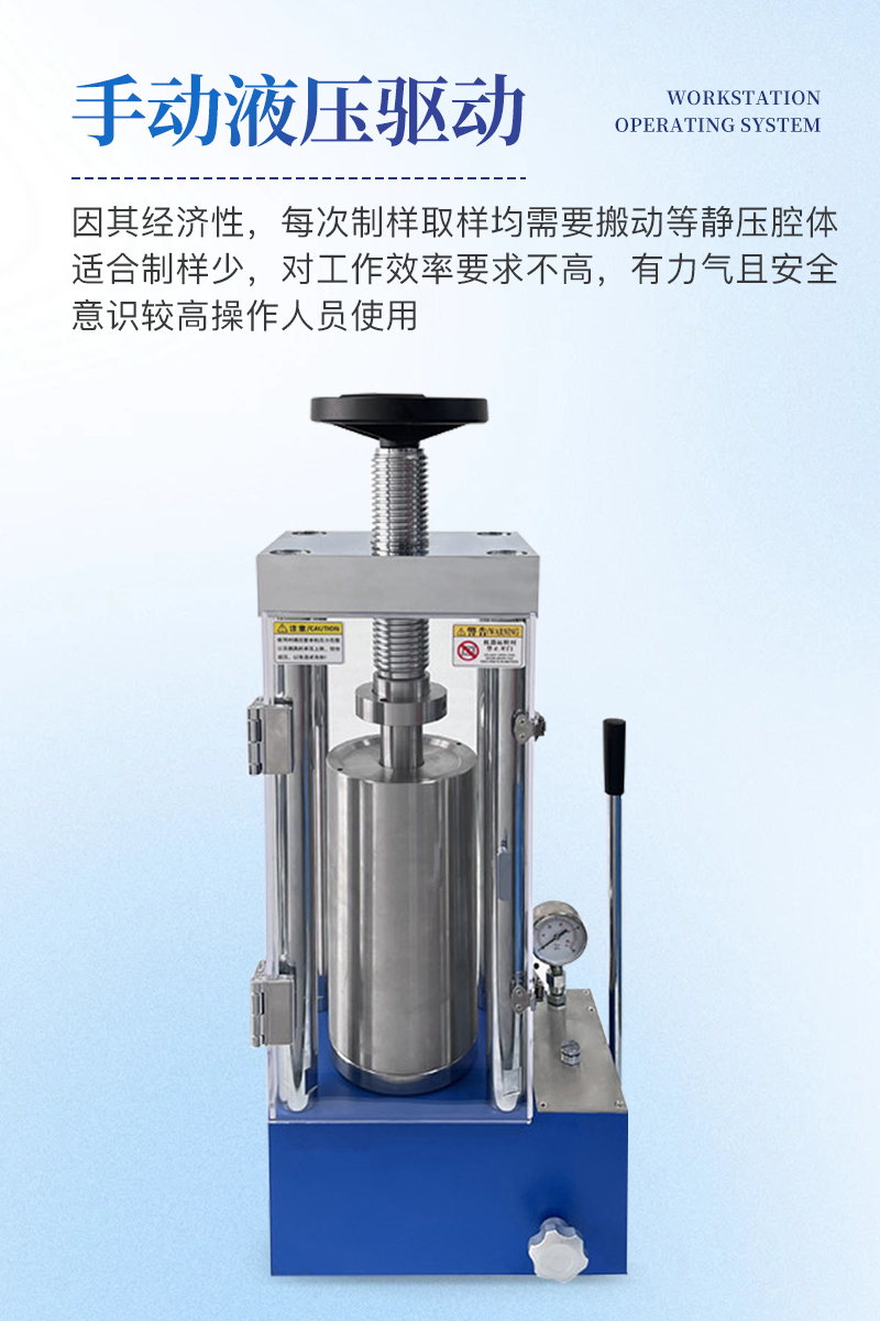 手動等靜壓機該機采用手動液壓驅動,是等靜壓系列中的入門機型,因其經濟性,每次制樣取樣均需要搬動等靜壓腔體,適合制樣少,對工作效率要求不高,有力氣且安全意識較高的男士操作使用。