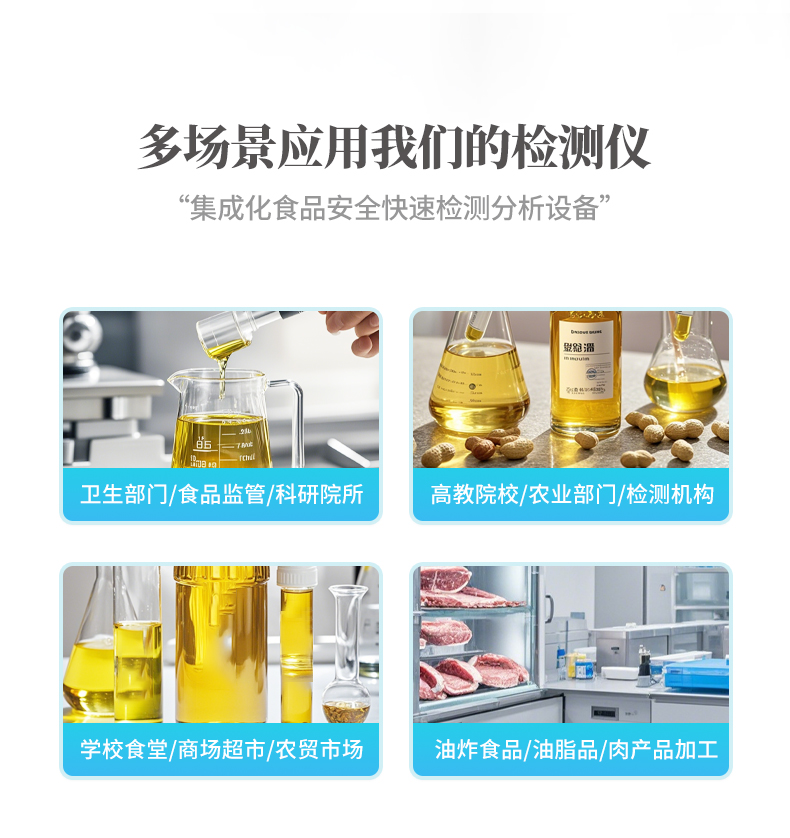 廣泛應(yīng)用于質(zhì)量監(jiān)督檢驗(yàn)、工商管理、油炸食品生產(chǎn)基地、食藥監(jiān)局、衛(wèi)生部門、肉制品食品深加工企業(yè)、商場超市、各大食品安全監(jiān)測系統(tǒng)等單位使用。
