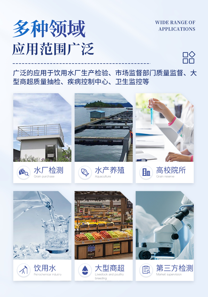 能夠廣泛的應(yīng)用于飲用水廠生產(chǎn)檢驗(yàn)、市場(chǎng)監(jiān)督部門(mén)質(zhì)量監(jiān)督、大型商超質(zhì)量抽檢、疾病控制中心、衛(wèi)生監(jiān)控等。
