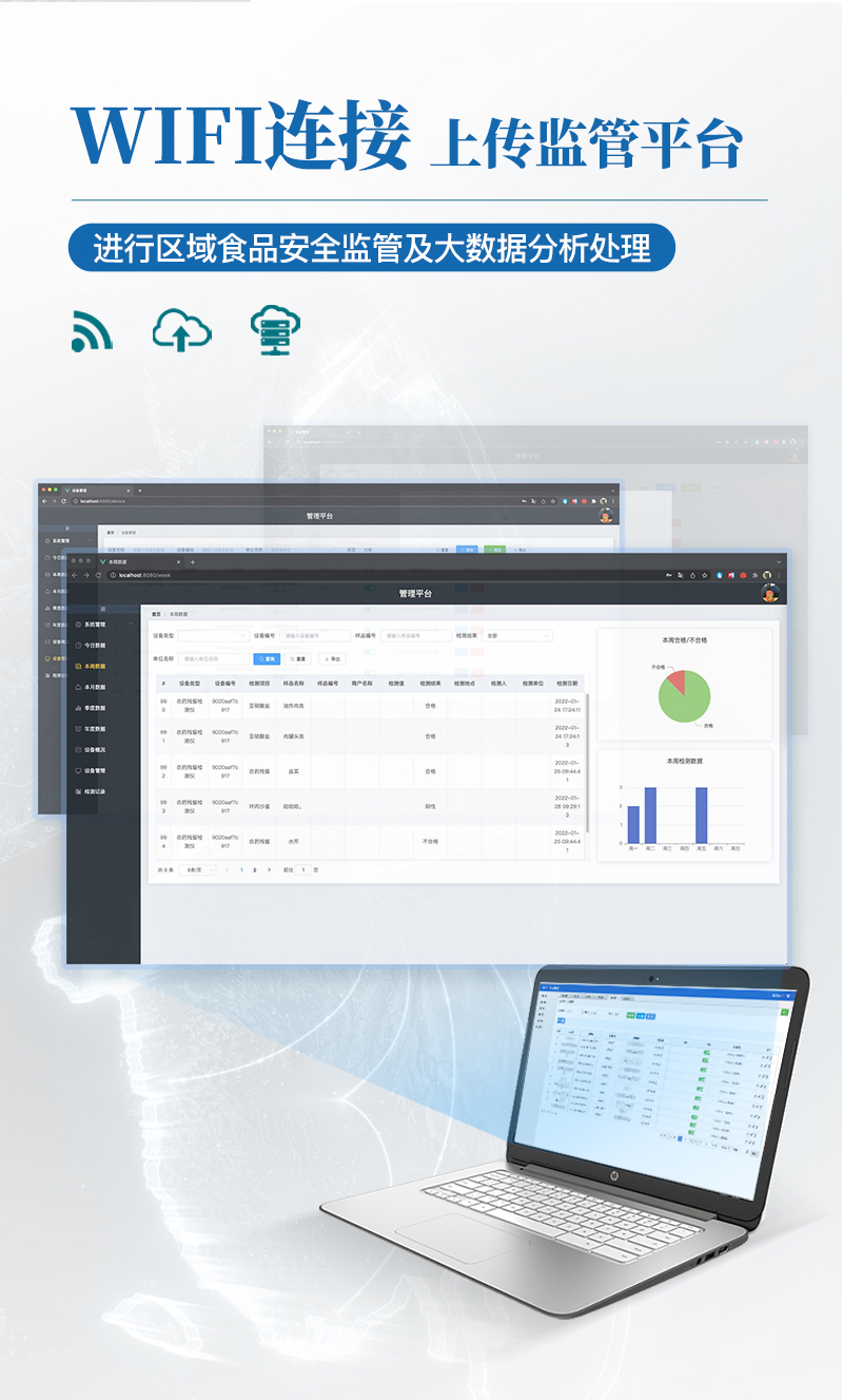 9.6、數據監管系統:同步對接監管平臺,數據可局域網和互聯網數據上傳,檢測結果可選擇直接傳至食品安全監管平臺。進行區域食品安全監管及大數據分析處理與數據統計,檢測區域食品安全長短期動態,達到食品安全問題預估、預警。